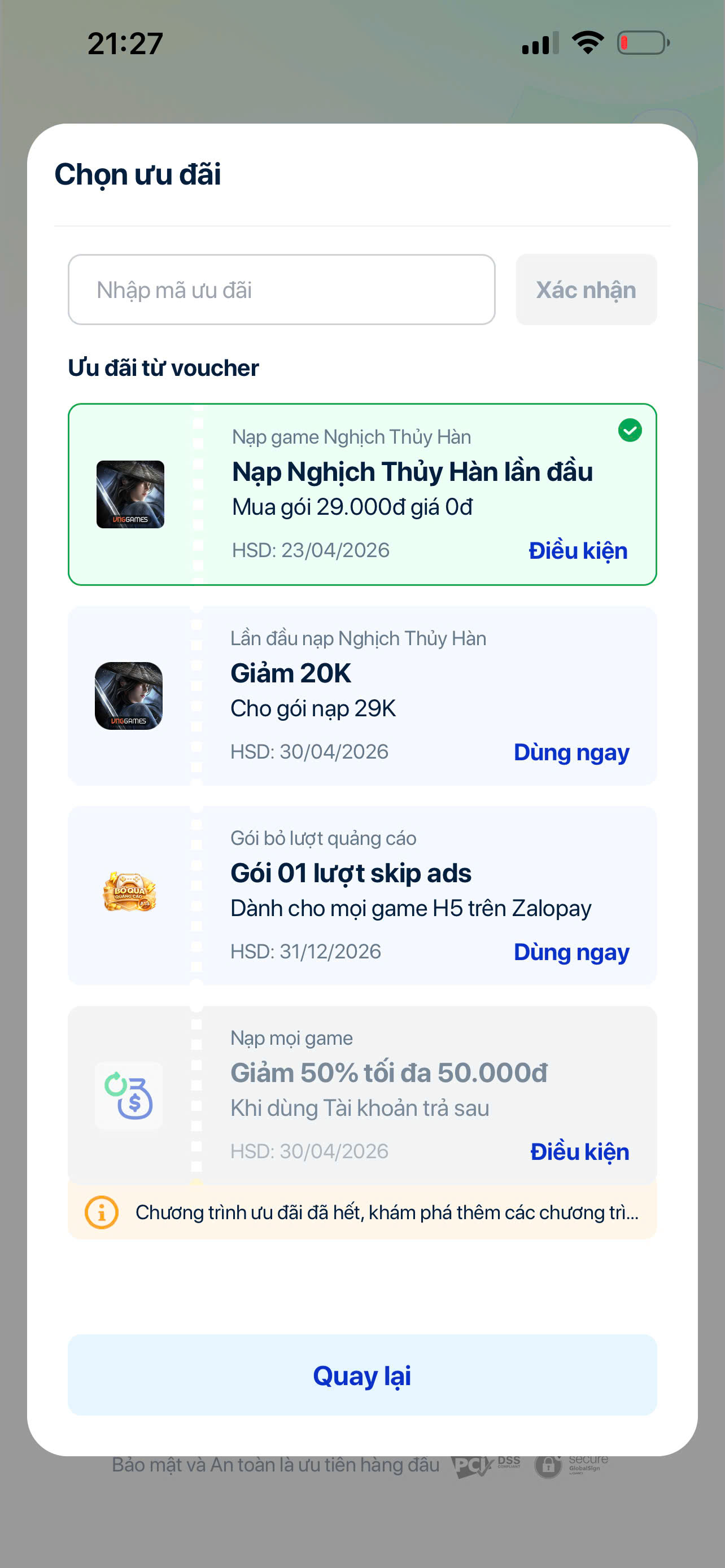 - Chương trình chỉ áp dụng khi khách hàng thanh toán nạp game Nghịch Thủy Hàn trên cổng nạp WEBSHOP bằng ứng dụng Zalopay